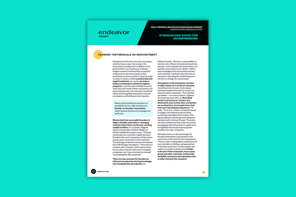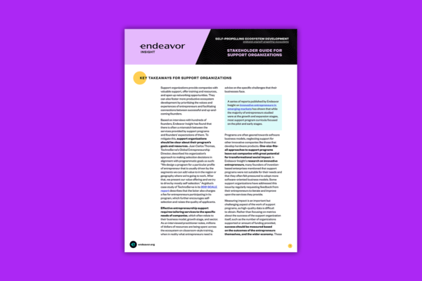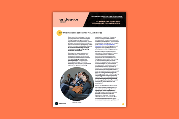 In addition to the primary guide, Endeavor Insight also developed guides for three key audiences: entrepreneurs, support organizations, and donors/philanthropies. These tailored resources include tools that are intended to help those stakeholders put the self-propelling ecosystem principles into practice.
