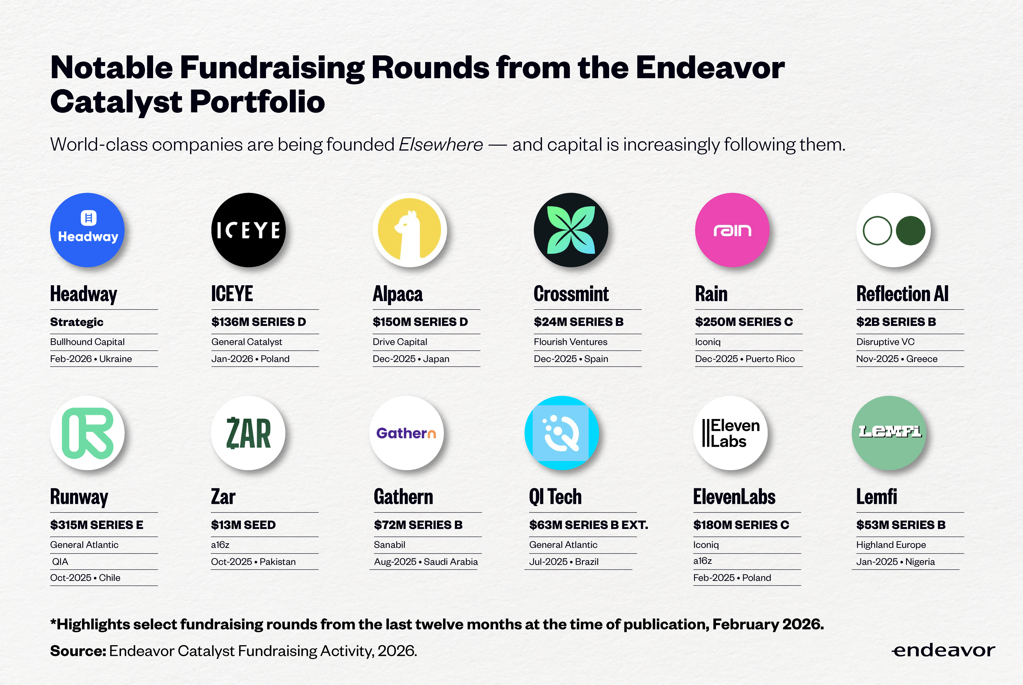 Always contrarian, Endeavor Catalyst firmly believes — and is proving — that opportunities for AI and other technologies abound Elsewhere. In fact, we averaged one investment per week in 2025 in companies from Elsewhere markets. These included: