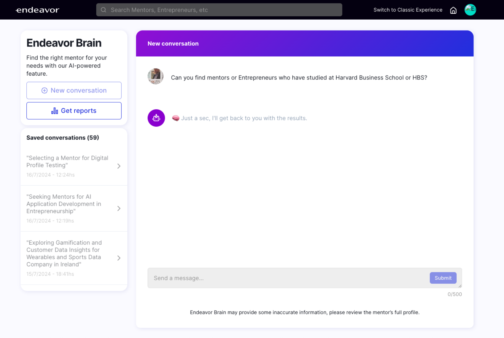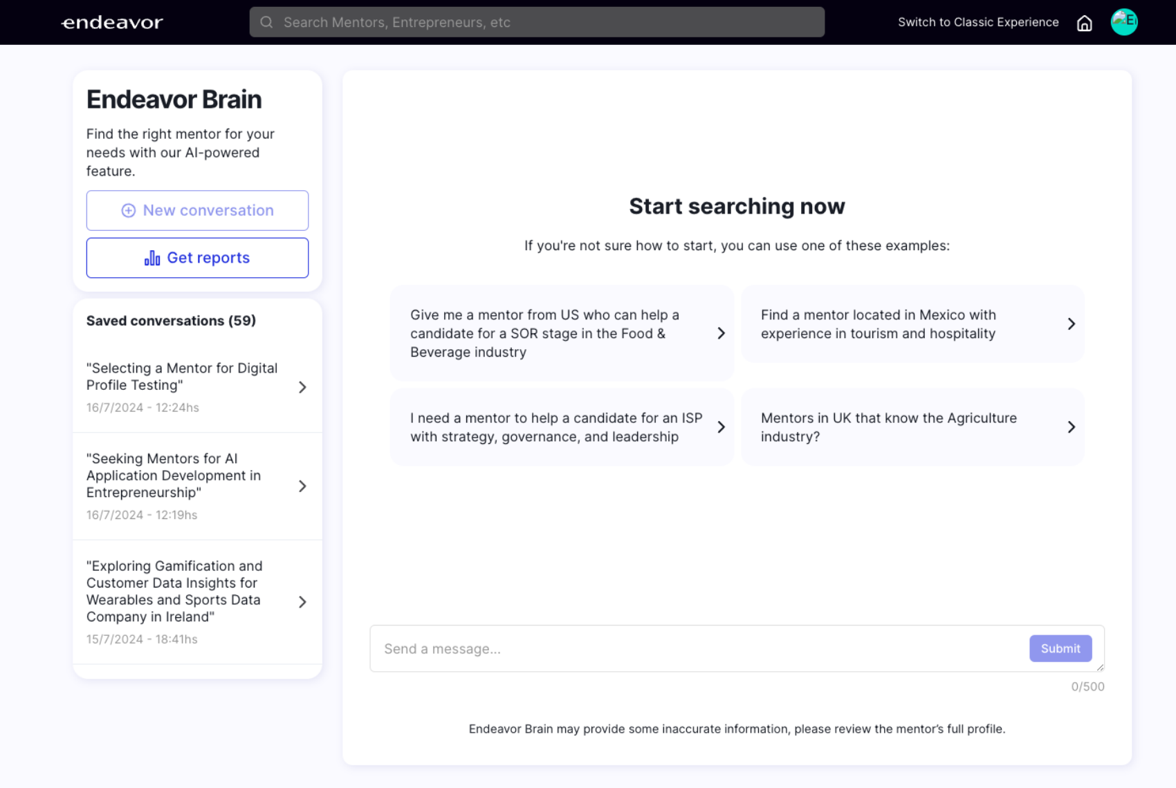Back in the summer of 2023 when everyone was talking about the incredible potential of ChatGPT and other generative AI tools, we at Endeavor noticed a pattern in our staff Slack channels: fully 60% of messages were team members requesting help finding a mentor to match with an Endeavor Entrepreneur looking for support.