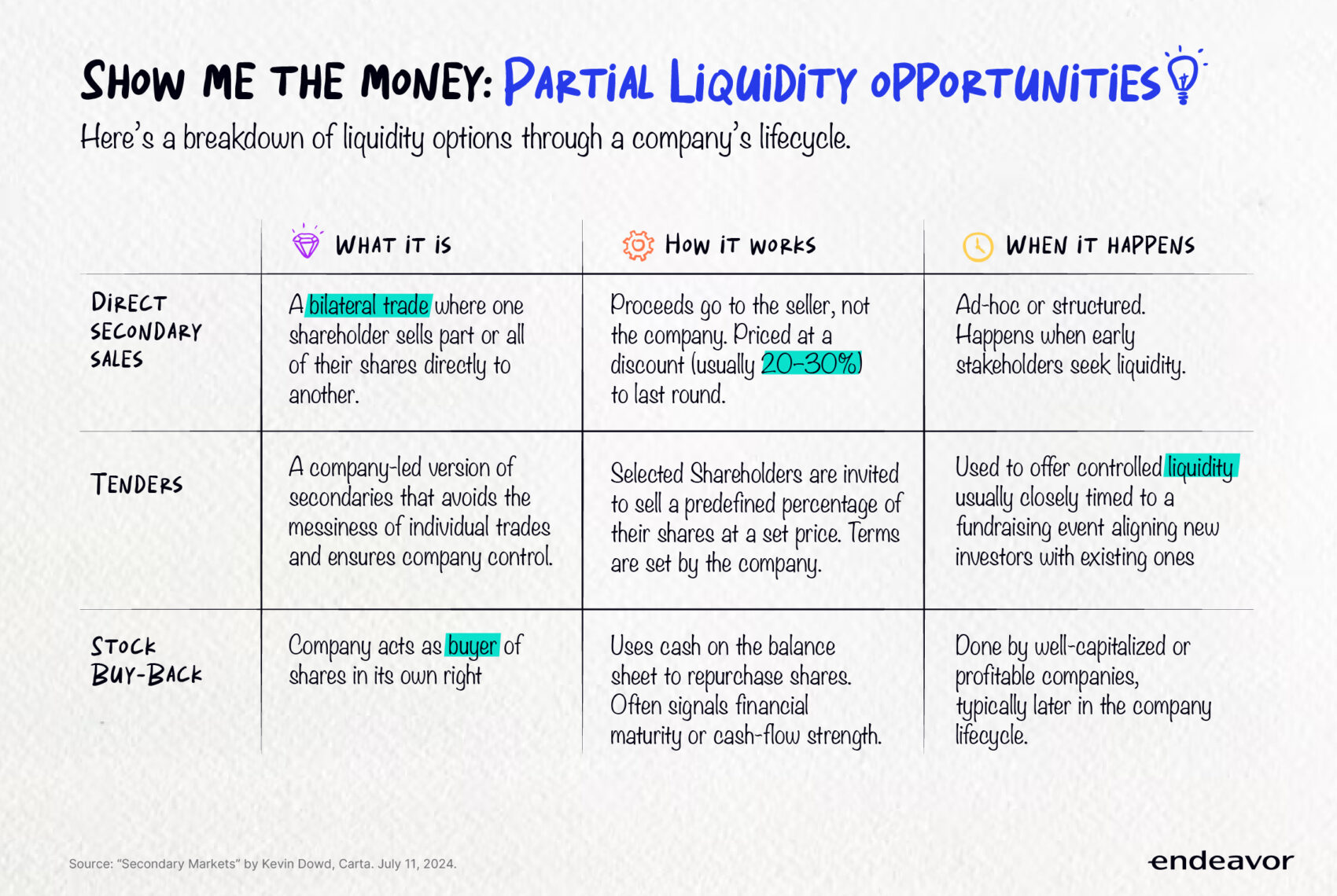 Each of these options comes with its own trade-offs. For example, a tender has the advantage of offering structured liquidity without individual shareholders having to source buyers or negotiate terms, while a buyback can send a powerful signal to the market that a company has strong financials. Companies in earlier stages will find it more convenient to organize smaller secondaries around primary rounds, while a more mature company may take risk off the table.