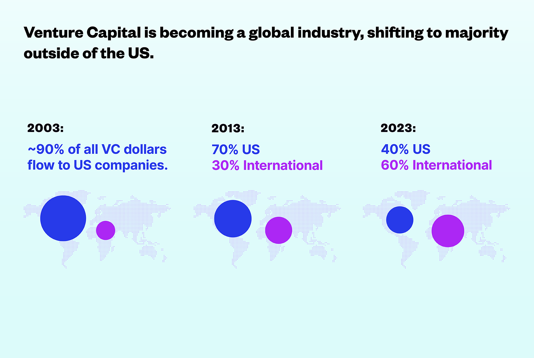 By 2013, that share of VC dollars being deployed outside the US had grown to roughly 30%. Last year, in 2023, that number was 60%. This shift is driven by the dramatic rise of venture ecosystems in China, India, Latin America, and beyond, and is accompanied by the growth of hundreds of unicorns and dozens of IPOs originating outside the United States.