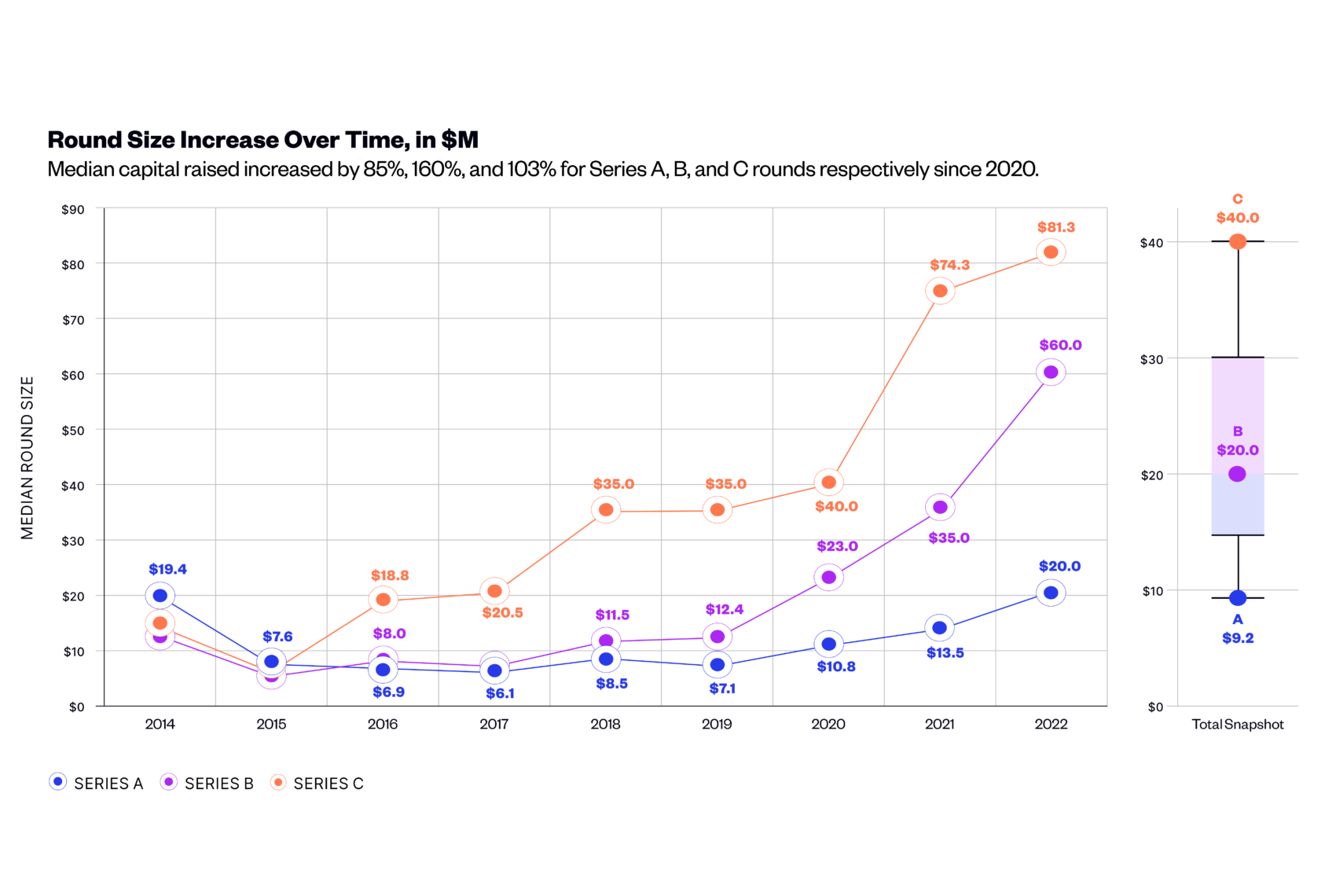 CHART: Round sizes ballooned in 2021, but series C size-growth decelerates in 2022