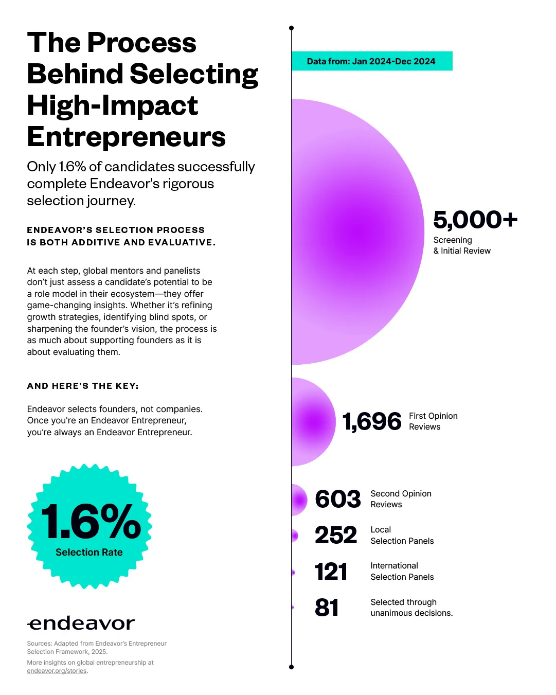 In 2024, only 81 companies led by high-impact entrepreneurs were chosen to join Endeavor. Our selection journey is rigorous because its goal is audacious: to pick those best positioned to build successful companies, and become role models and multipliers in their ecosystems.